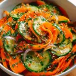 Combining the crisp freshness of vegetables with a tangy dressing enriched with sesame oil and a hint of sweetness, this salad appeals to all palates. The vibrant colors delight the eyes, while the textures play together — the crunchiness of the cucumbers, the tender bite of the carrots, and the slight chewiness from the sesame seeds all create a delightful experience. With its quick assembly and the assurance that fresh flavors will resound in every bite, this salad will quickly become a cherished recipe in your culinary repertoire.