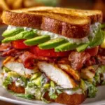 An elevated classic, this Loaded Chicken Club Sandwich features grilled chicken, crispy bacon, creamy avocado ranch, and fresh veggies layered between perfectly toasted bread.
