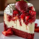A delightful and indulgent red velvet cheesecake layered with fresh strawberries and topped with whipped cream, perfect for celebrations.