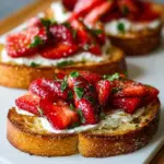 A delightful combination of creamy whipped ricotta and warm roasted strawberries served on crispy sourdough toast, perfect for brunch or a snack.
